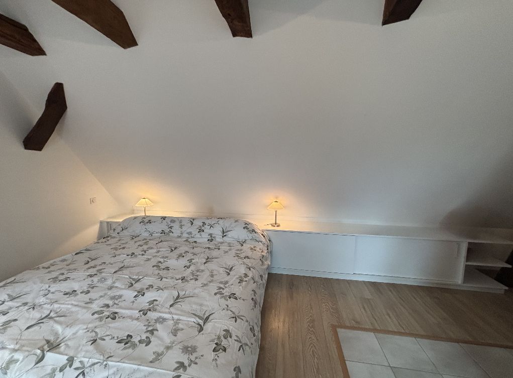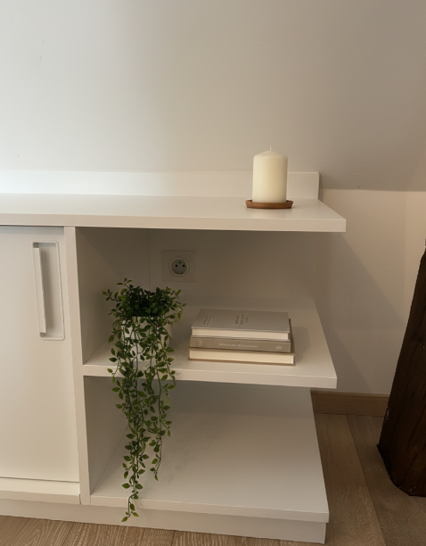 Meuble bas sur mesure sous rampant, entièrement conçu, fabriqué et posé par nos soins. Les portes coulissantes permettent un accès facile tout en optimisant l’espace disponible. En bout de meuble, une niche ouverte sur deux côtés vient alléger l’ensemble et apporter une touche déco, idéale pour exposer livres ou objets. Un projet pensé dans le détail pour allier fonctionnalité, sobriété et élégance.